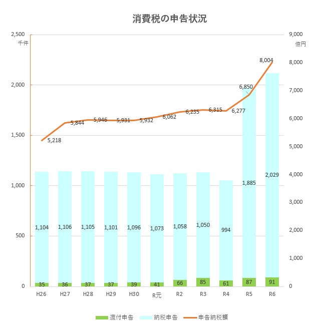 令和5(2023)年10月からインボイス制度が導入された影響を受け、消費税の申告件数は、212万件(対前年比+7.5%)で、申告納税額は、8,004億円(対前年比+16.8%)となっており、前年分から1,154億円増加しました。