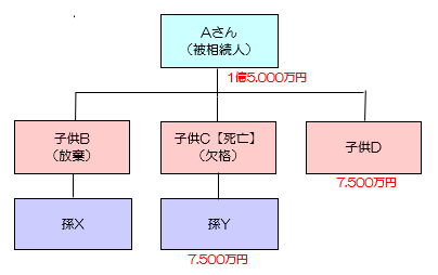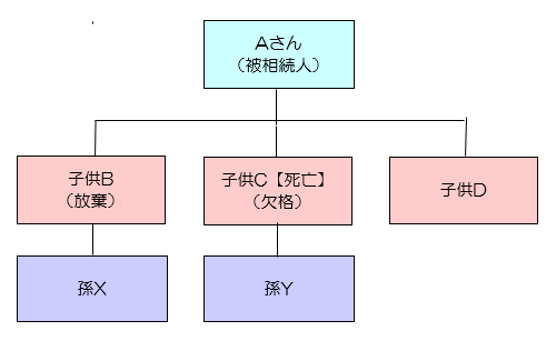 Aさんの配偶者はすでに他界、子供B・C(死亡)・D、孫X・Yがいます。